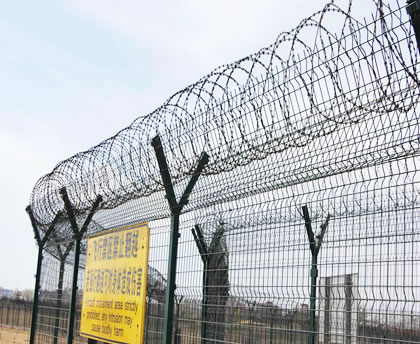 机场护栏网又称作机场隔离栅、Y型安全防御护网,是由V型支架立柱,加强型焊接片网,安全防盗连接件和热镀锌刀片刺网组成强度和安全防御性级别很高。近年来,被广泛应用在机场,军事基地等高安全场所。